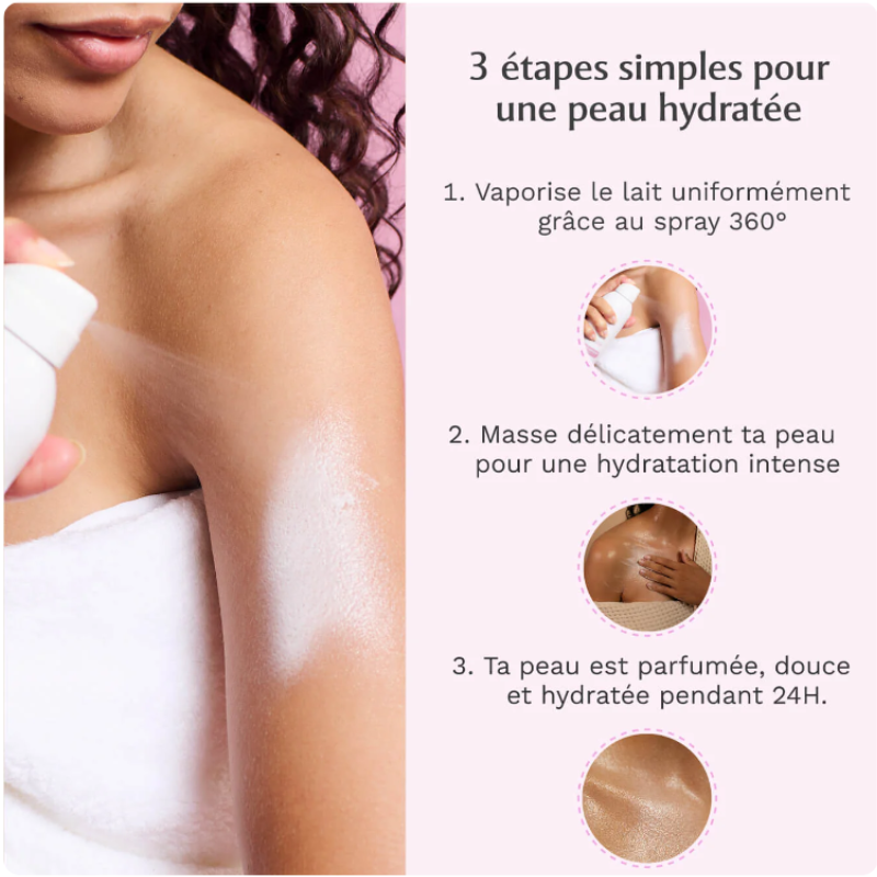 Formulé en France et testé sous contrôle dermatologique, le Lait Spray hydrate la peau pendant 24H grâce au beurre de karité et à l’aloe vera. Sa formule légère, sans nanoparticules ni ingrédients controversés, laisse la peau douce et intensément parfumée toute la journée.
